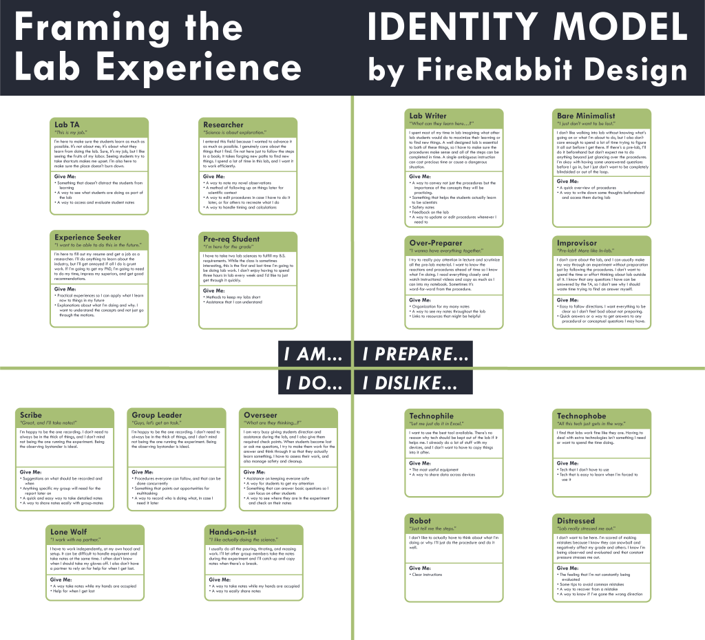 We created 4 personas that represented our core demographic. This is compromised of a Teaching Assistant, Lab Worker, Intro Level Lab Student, and an Advanced Lab Student.