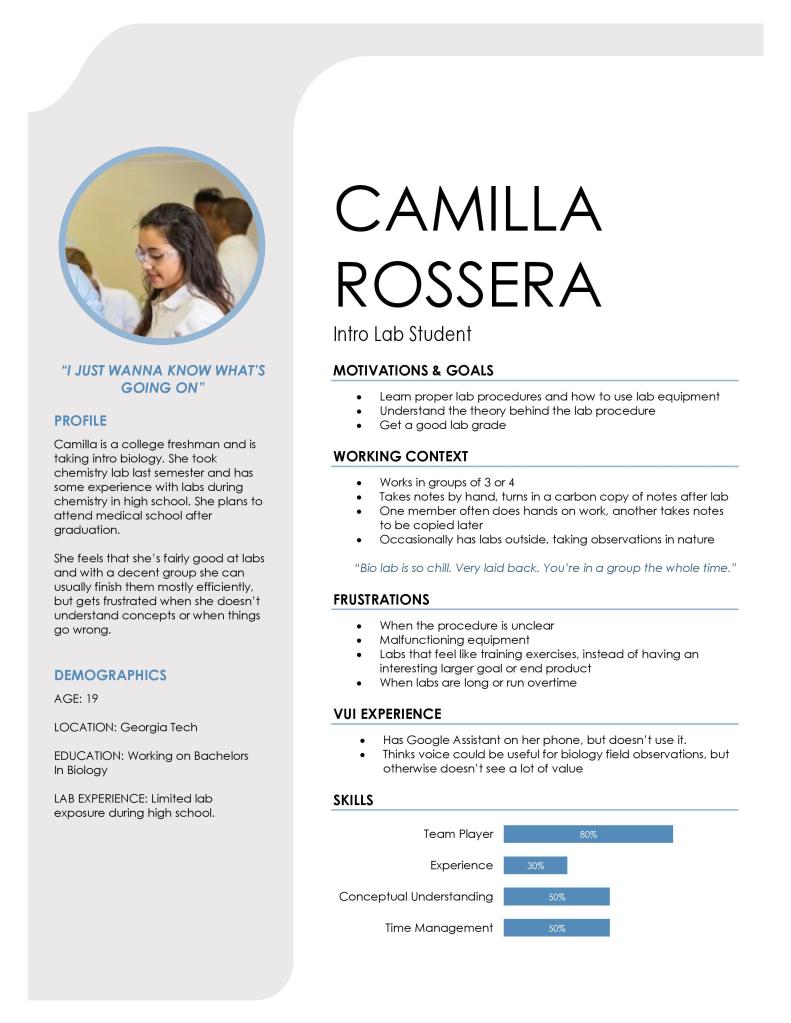 Questions touched on topics such as prior tech and lab experience, common actions in a lab, and lab frustrations. Additionally, we observed an upperclassman biochemistry lab during experimentation.
