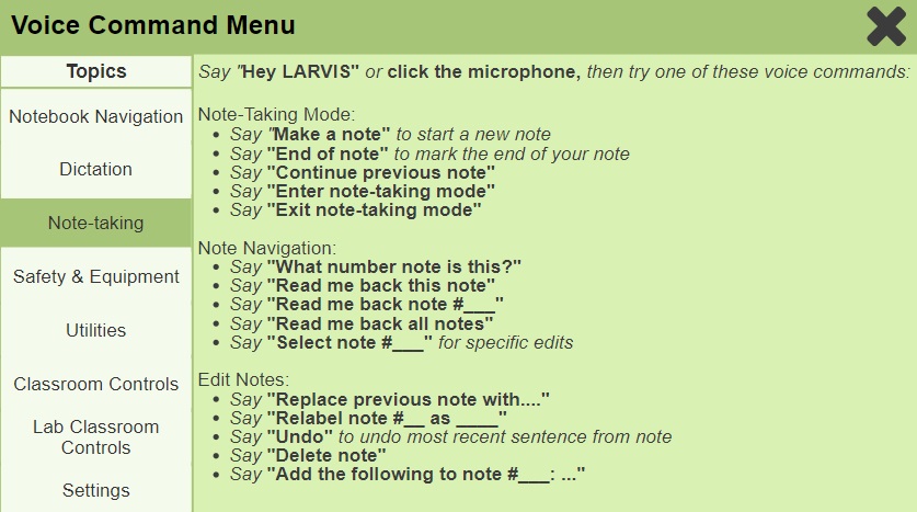 The visual interface for LARVIS is similar to common word processors and note-taking software. This design allows for easier on-boarding and greater intuitive use, since users can navigate the software with their pre-existing schema. The software also fully supports keyboard and mouse use so the user doesn’t have to completely rely on voice.