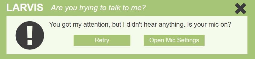 - LARVIS responds with error information or suggests the “What Can I Say?” menu
