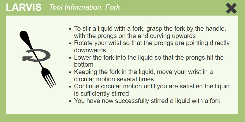 In order to test LARVIS our team conducted remote evaluations utilizing the Wizard of Oz testing method. Unfortunately, the COVID-19 pandemic prevented any in-person assessments. Two members of our team operated the prototype: one operating visual elements while the other played synthesized voice responses.